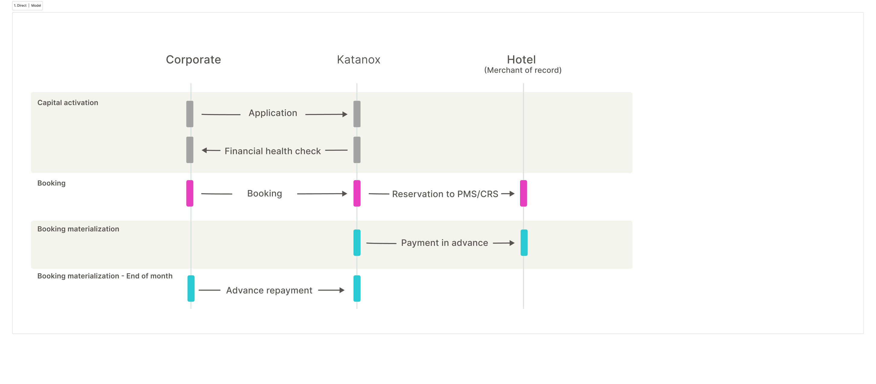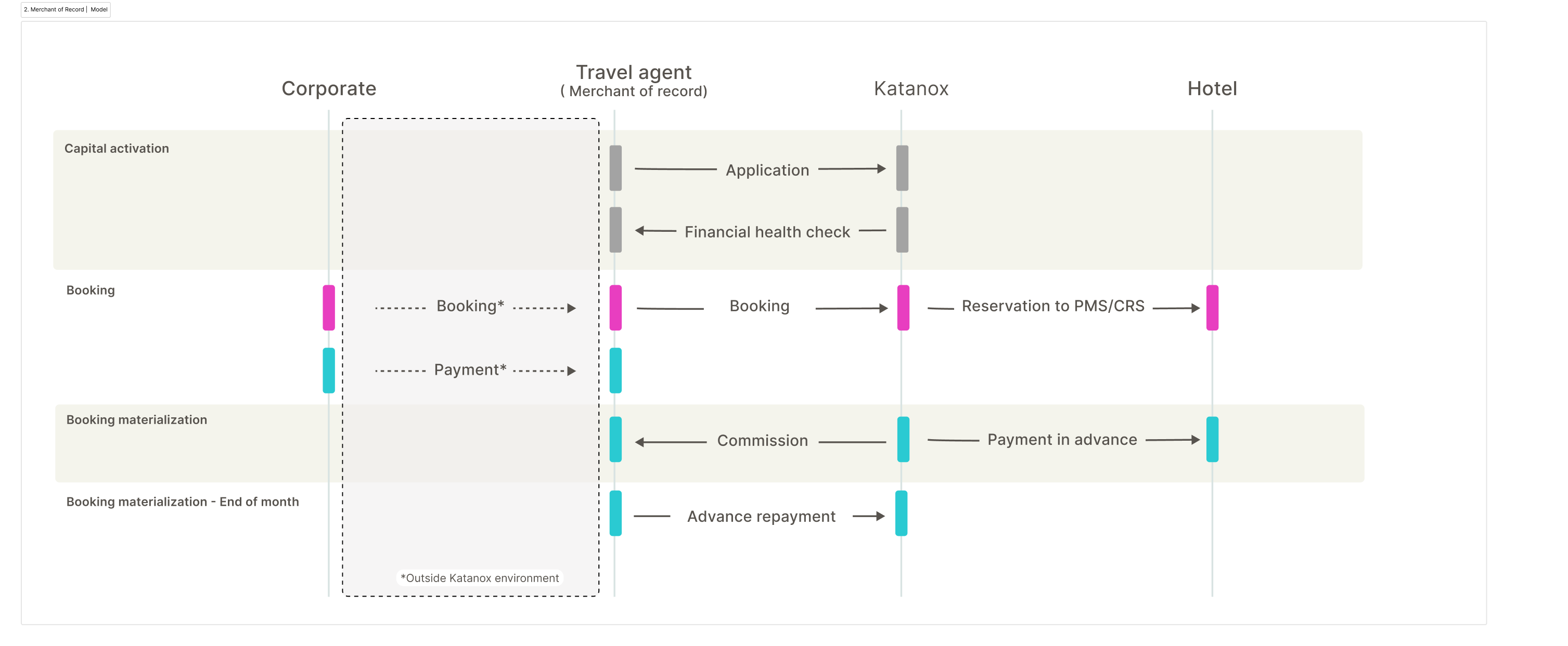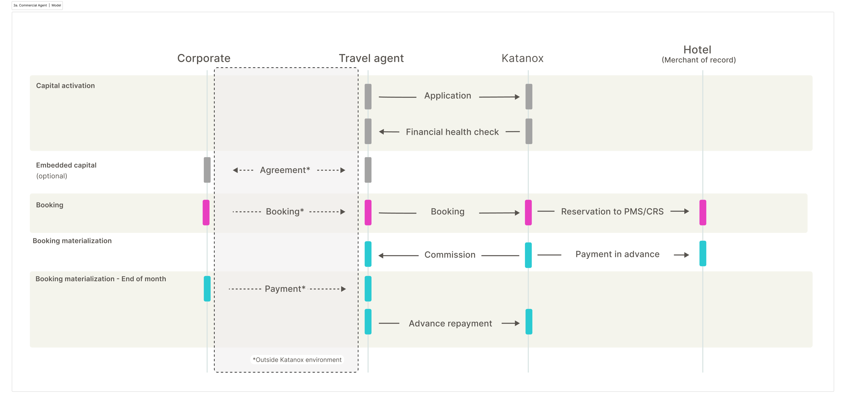 - The travel agent settles with Katanox on a monthly basis, and the corporate client settles with the travel agent, with the option to execute it with embedded capital.